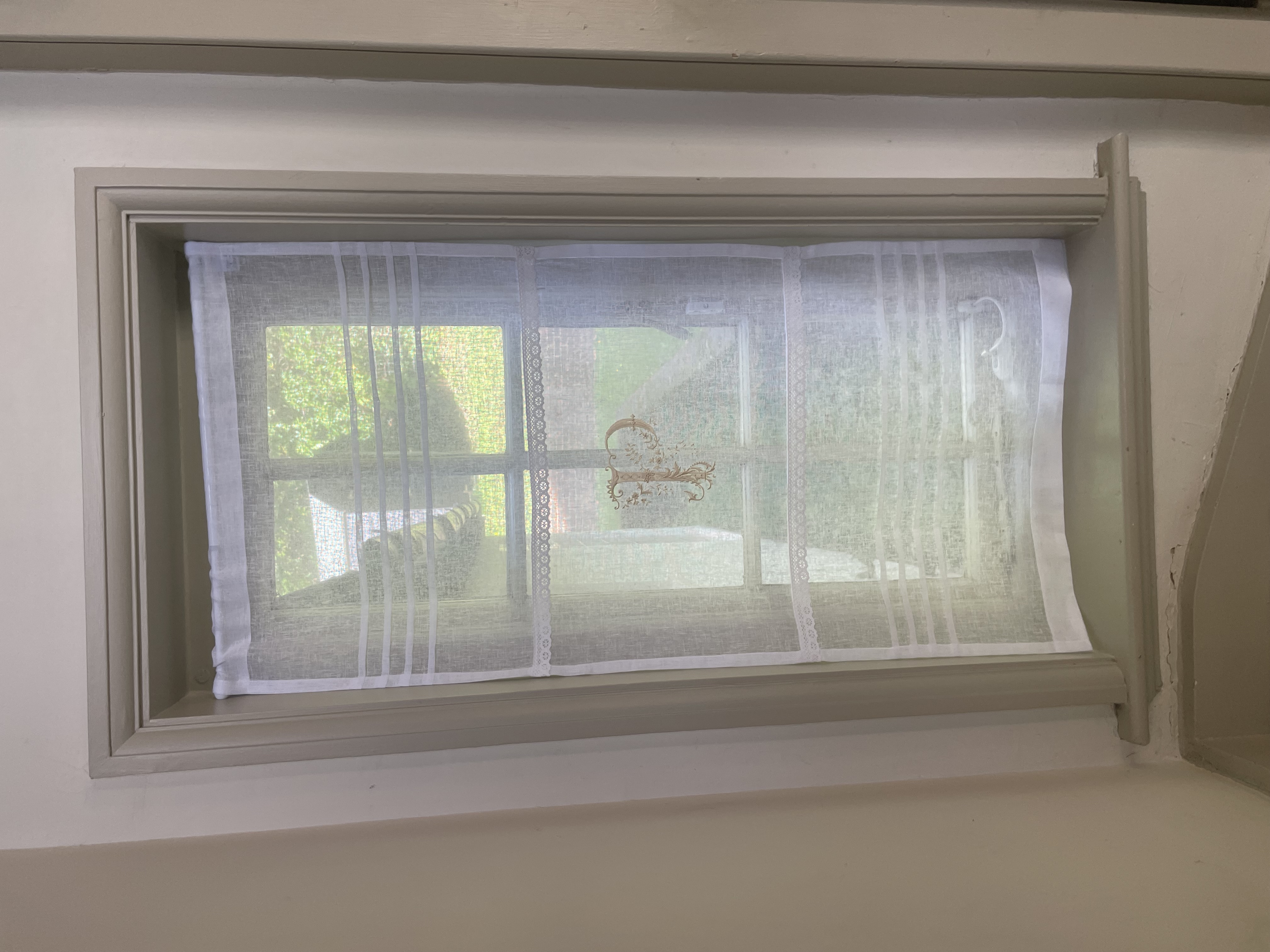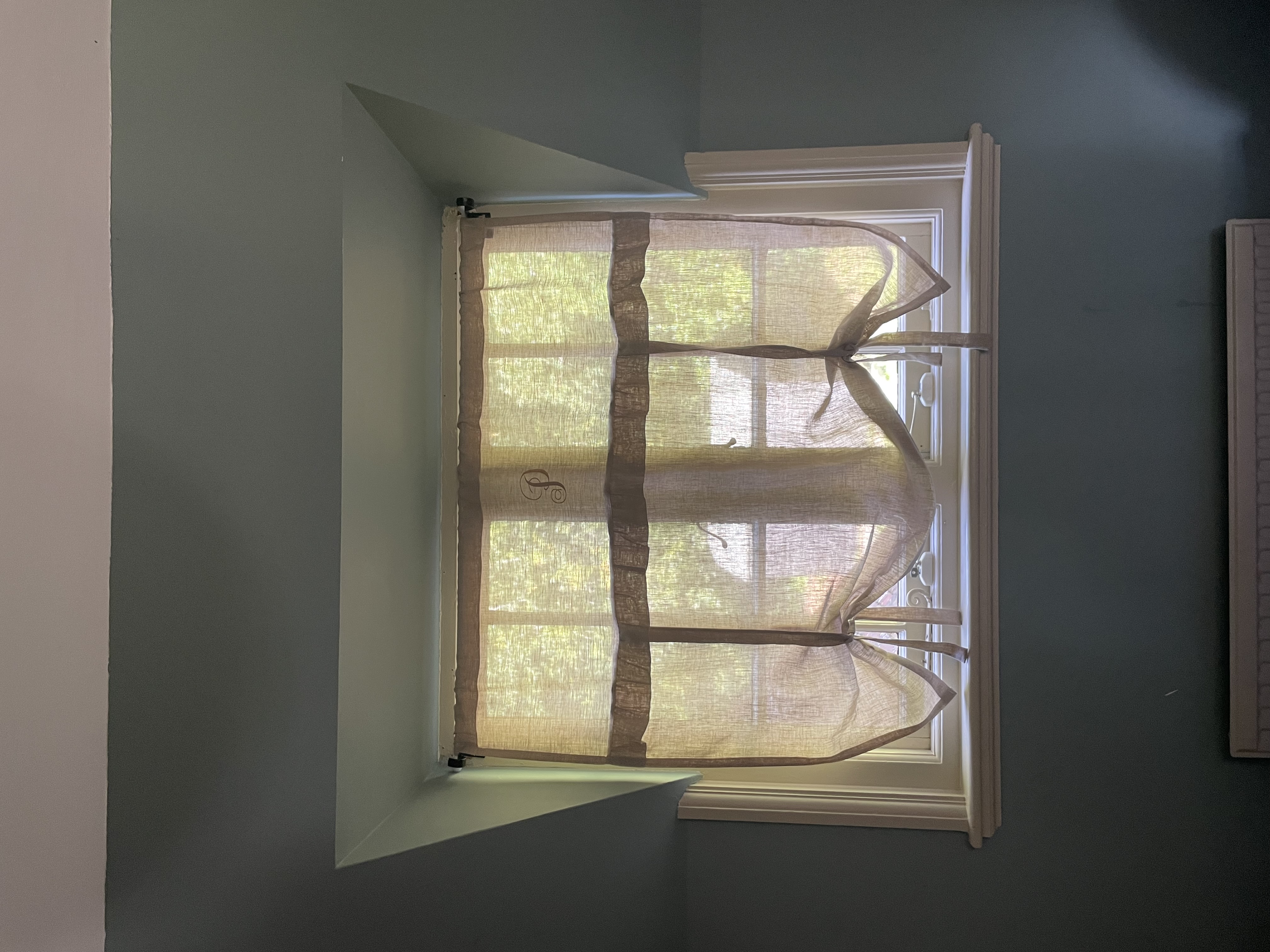 White sheer linen lace panel which can be used as a cabinet, door or window curtain with 2" rod pockets at the top and bottom. It is made from a sheer, semi transparent linen allowing sunlight to penetrate.
